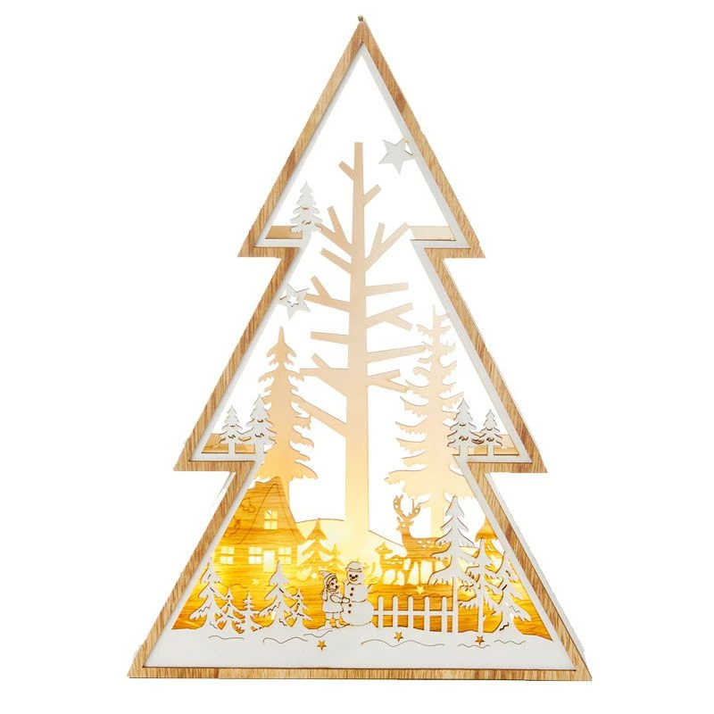 Get an illuminating cosy glow in your home this Christmas period with this LED lit tree shaped woodland diorama scene. The tree shaped light is bordered with white wood, framing a choice of peaceful festive scenes. Choose from two designs, one design is of a beautiful little cabin tucked away in a woodland with reindeer standing proudly in the background. In the foreground there is a child building a snowman in the garden completing the 3D festive feel of this Christmas decoration. Or, this beautiful wooden diorama is also available in a reindeer family design. This woodland scene depicts a family of deer surrounded by pine trees with stars at the top to complete the festive feel. These 3D dioramas are battery powered and ideal for displaying indoors on a mantle piece or window sill.