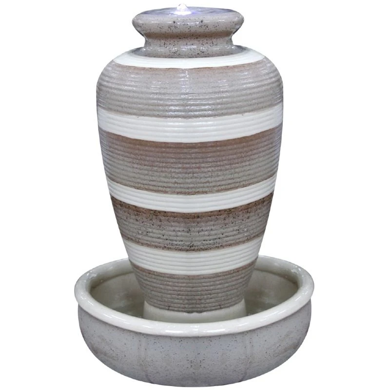 This Riviera style water feature has a unique pattern and design, bringing tranquillity to any garden. The water flows down the unique rippled vase shaped feature and back into the base. This classic styled water feature is made from ceramic and includes LED lighting and it is self-contained and mains powered.