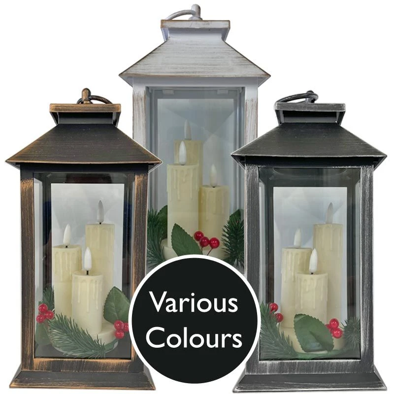 Add a rustic vintage touch to your Christmas decoration at home this festive season with this flickering flame (flickabright) lantern. Available in a choice of 3 colours – white, copper & silver to match your choice of Christmas theme, the LED flickering flame will add a warm and inviting glow to your home every evening. Each lantern features 3 candles inside with a melted edge effect, and the candles flicker gently for a warm white glow. The base of the candles are decorated with some red holly berries, and twigs of green pine tree. This lantern also features a handy timer function, so no need to worry about remembering to turn the lantern off every time.