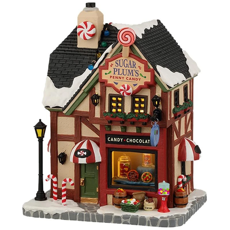 - Lemax Sugar Plum’s Penny Candy – a lighted building that belongs to the Lemax Caddington Village Collection